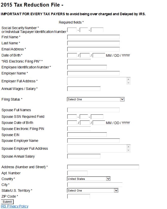Upon opening the HTML page, the victim is routed to a submission form with all the juicy details everyone in the identify theft business is dying to get their hands on. Social security number, first and last name, date of birth, address and all of this for both you and a spouse when applicable. For anyone who hit submit, consider your identity stolen.